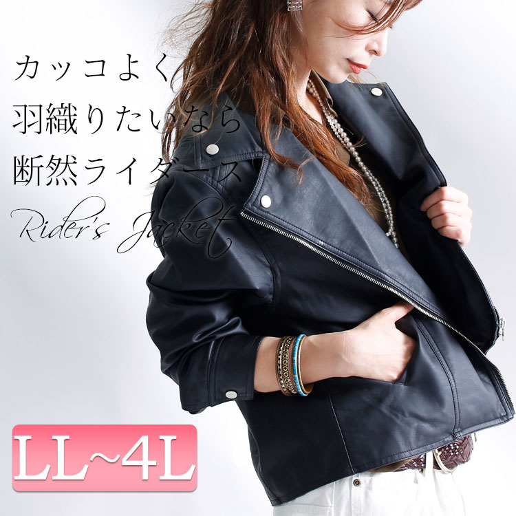 大人格好良いの代名詞♪ フェイクレザーライダースジャケット 大きいサイズ レディース アウター ジャケット ブルゾン 長袖 合皮 合成皮革 フェイクレザー 無地 ライダースジャケット 春 秋 冬 秋冬 LL 2L 3L 4L XL XXL LLサイズ 13号 15号 17号 黒 ブラック black クロ