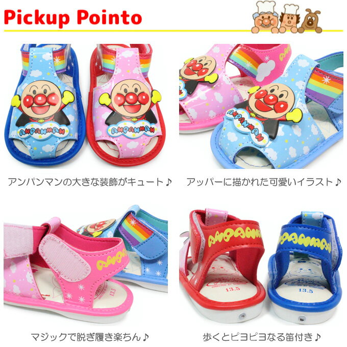 ▼ メール便・定形外郵便のご注意 ▼ 必ずご確認ください 商品名 アンパンマン 7600 日本製 笛付きサンダル 靴 サンダル ベビー キッズ 笛 ベビーサンダル キッズサンダル 男の子 女の子 キャラクター 笛サンダル 子供靴 ギフト 人気 安い 激安 通販 おしゃれ かわいい 商品特徴 アンパンマンからピヨピヨ可愛い笛付きベビーサンダルです。